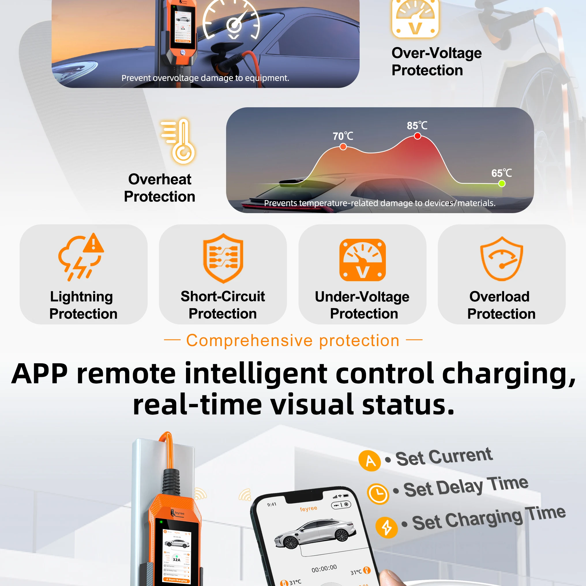 2. Sécurité à Double Température + Multi-Protection : Surveillance de la température en temps réel à la prise et au boîtier de contrôle avec réduction automatique de la puissance. Six protections certifiées : fuite/surtension/sous-tension/foudre/surintensité/protection à la terre.
