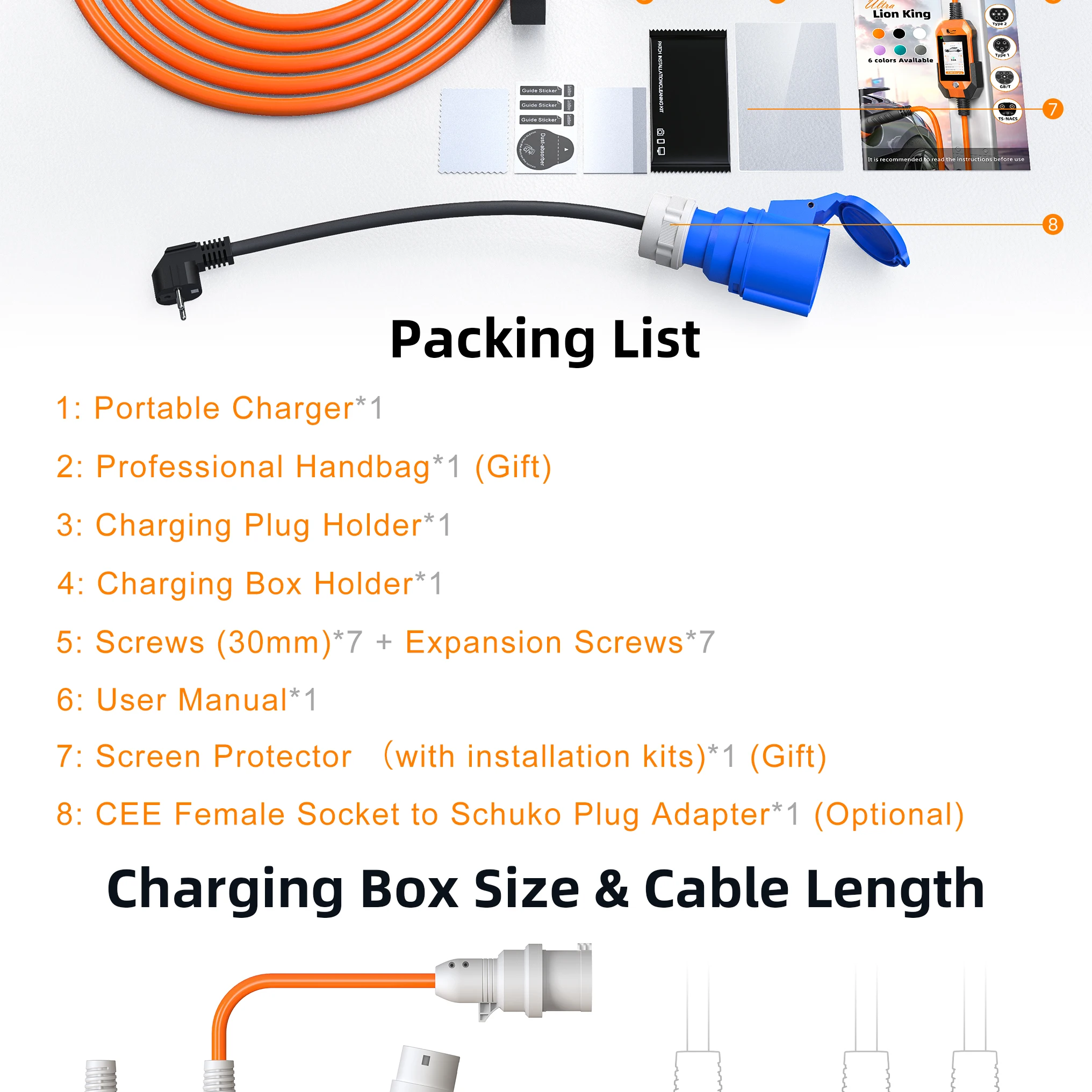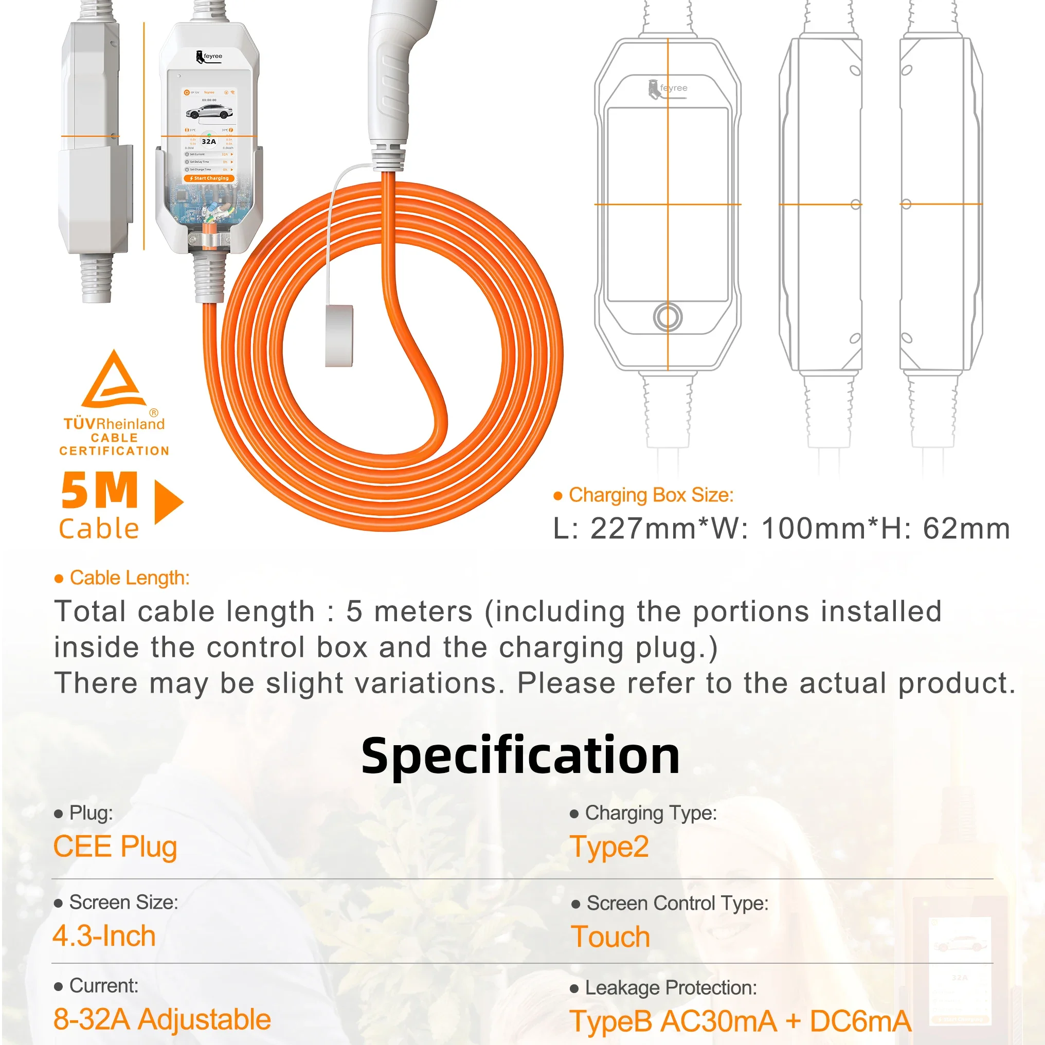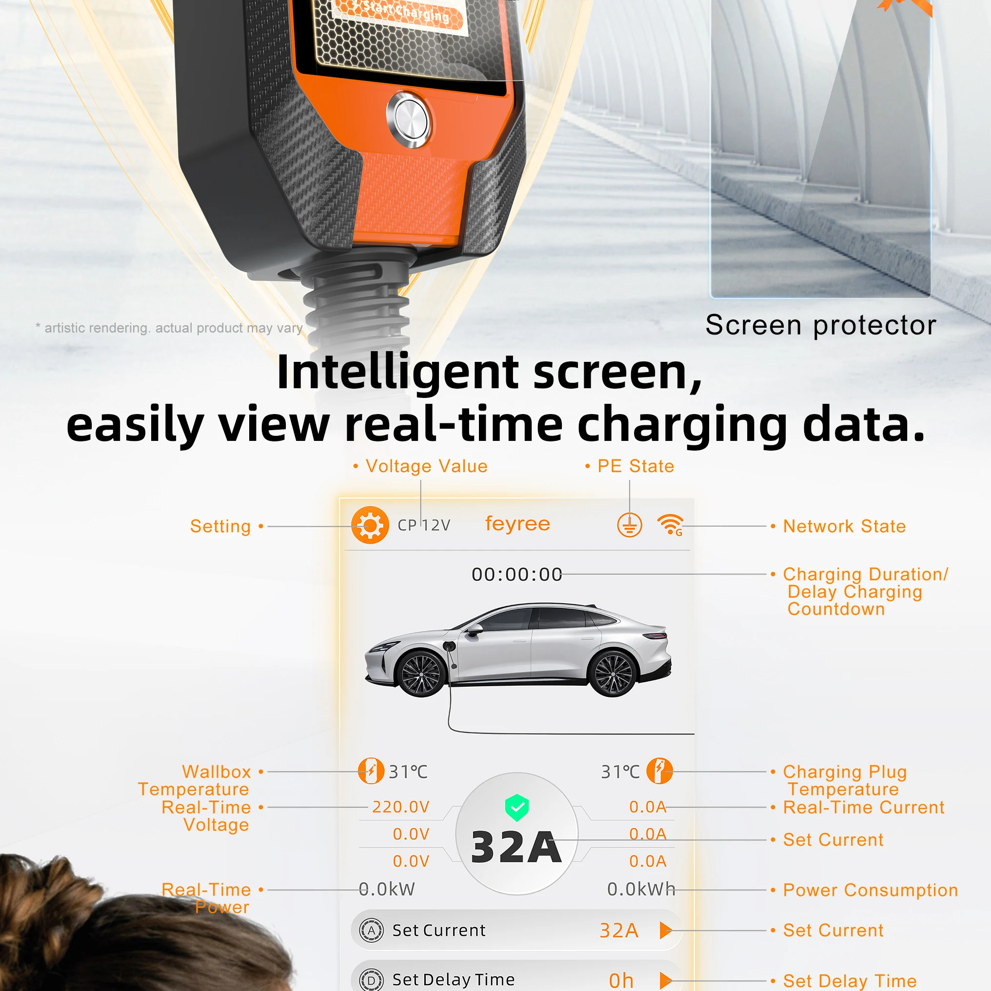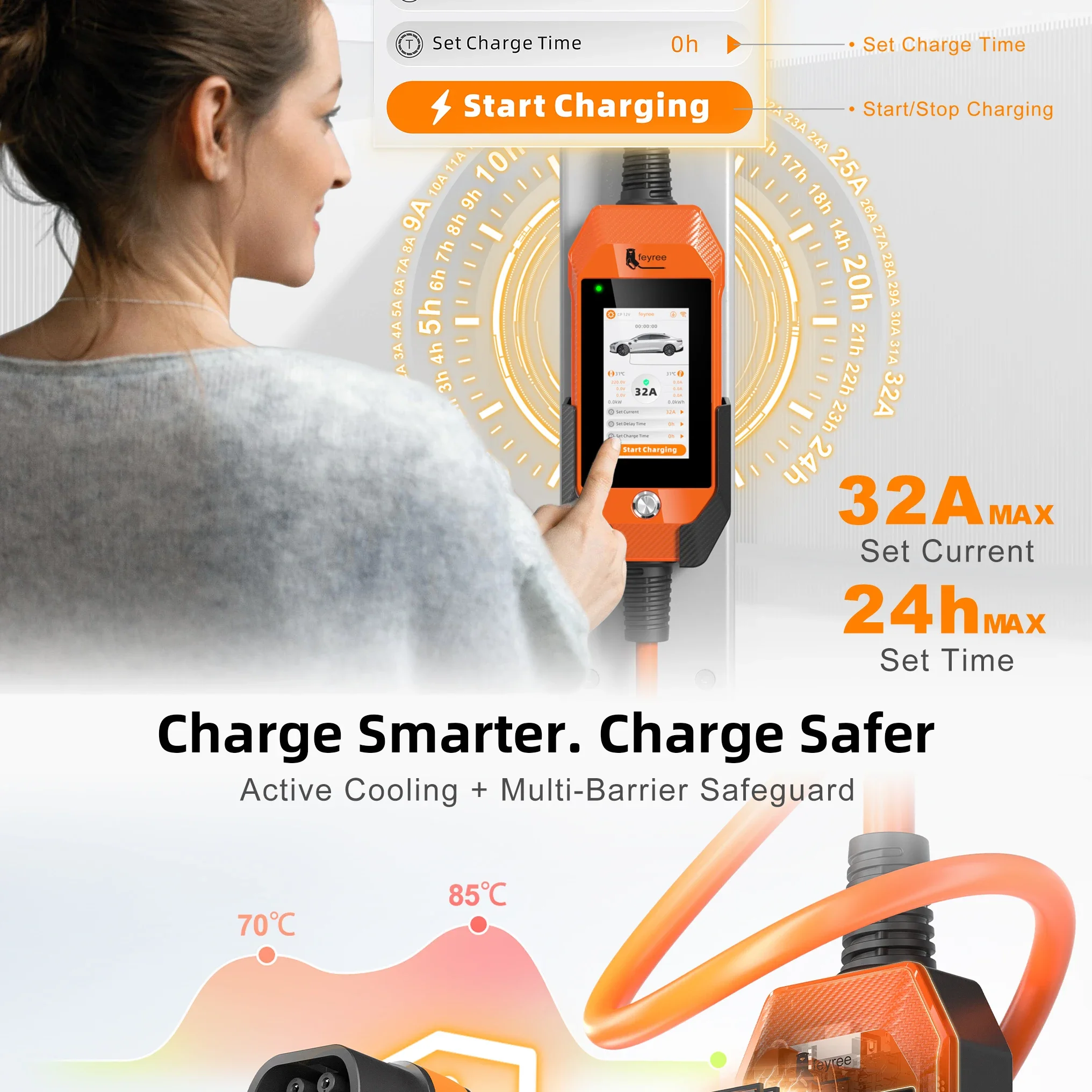 Personnalisez facilement votre expérience de charge en définissant des heures de début/fin, des délais (1-24 heures) ou des durées spécifiques (1~24 heures) pour automatiser la charge et éviter les périodes de tarif de pointe pour des économies significatives. Ajustez l'intensité de manière flexible (8~32A via le boîtier de charge ou l'APP) — tout conçu pour un maximum de commodité et d'efficacité.