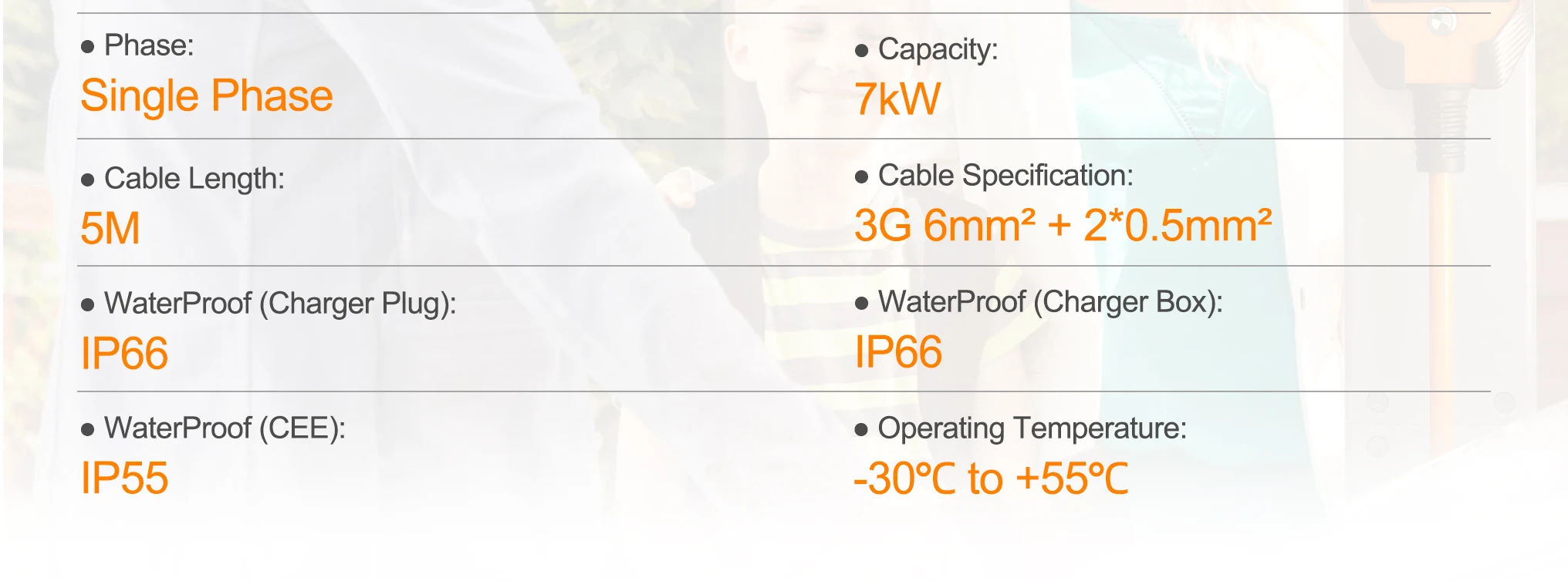 Surveillance de la température en temps réel à la fois à la prise et au boîtier de contrôle. Réduit automatiquement la puissance en cas de surchauffe. Combine six protections : fuite/surtension/sous-tension/foudre/surintensité/protection à la terre - toutes certifiées pour la sécurité complète de l'utilisateur, du véhicule et de l'équipement.
