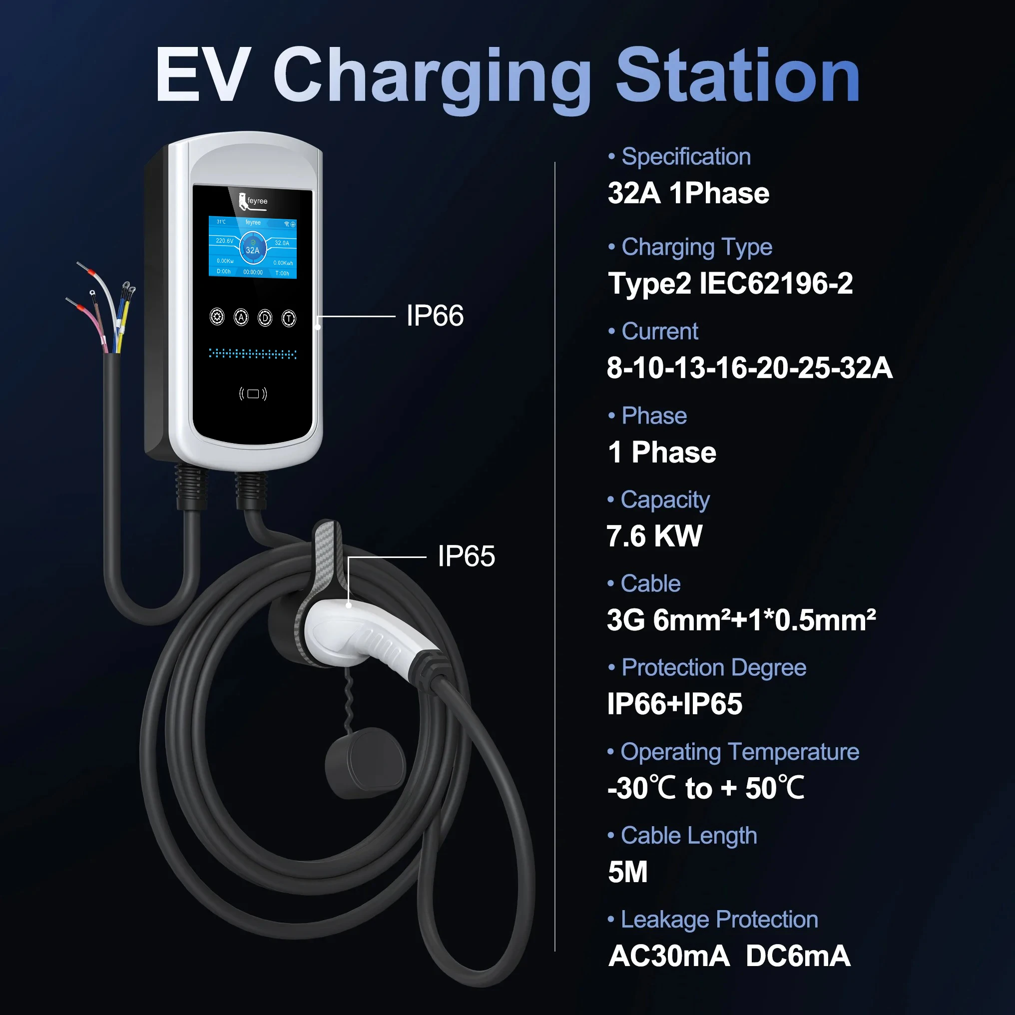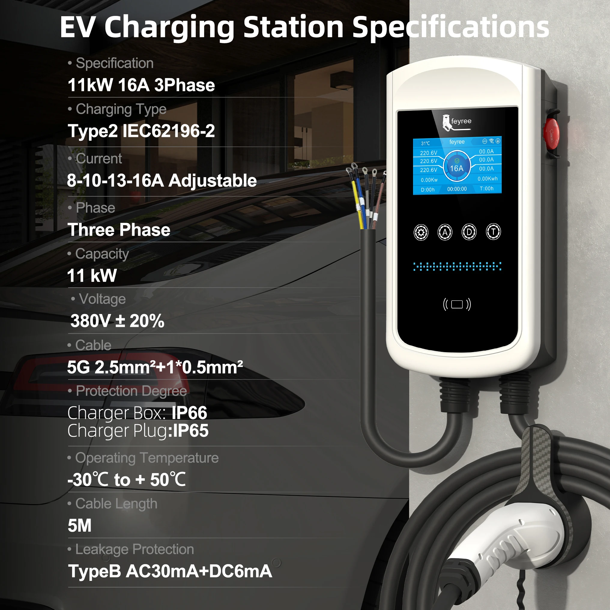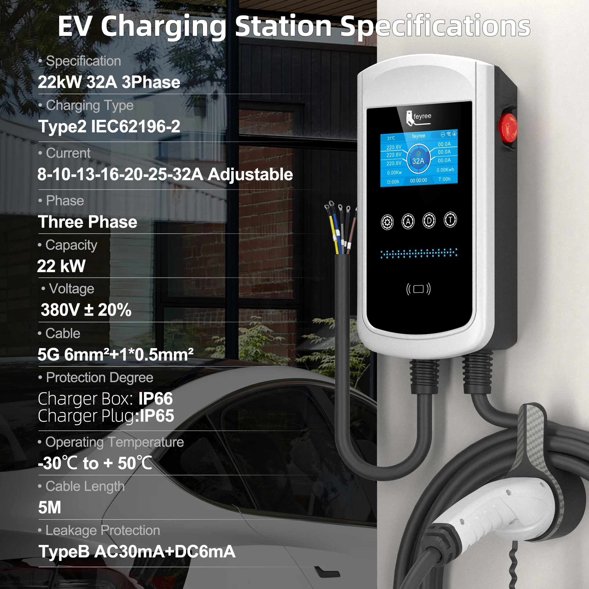 - Change the current: 8A/10A/13A/16A/20A/25A/32A adjustable (7kw/22kw)