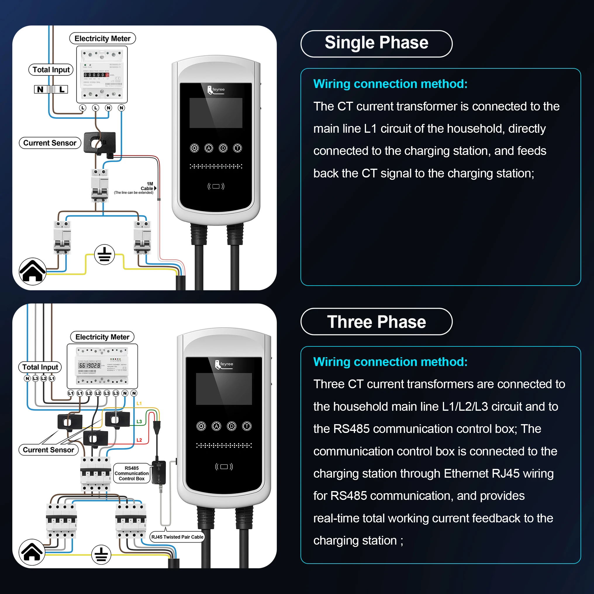 Install the sensor on the live wire of the household's main circuit ,measuring real-time output total current data information from home electrical system ,and transmit it to Wallbox,The Wallbox will adjust current or stop charging depend on your household's energy consumption by intelligently.