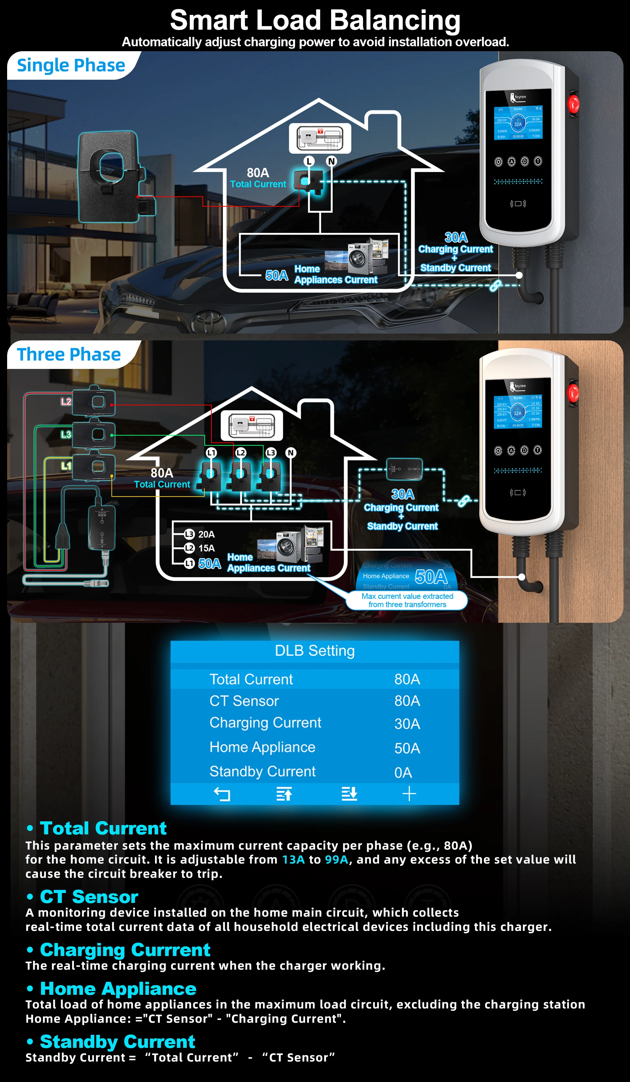 Flexible Current Adjustment:8A/10A/13A/16A/20A/25A/32A adjustable(7kw&22kw version)
