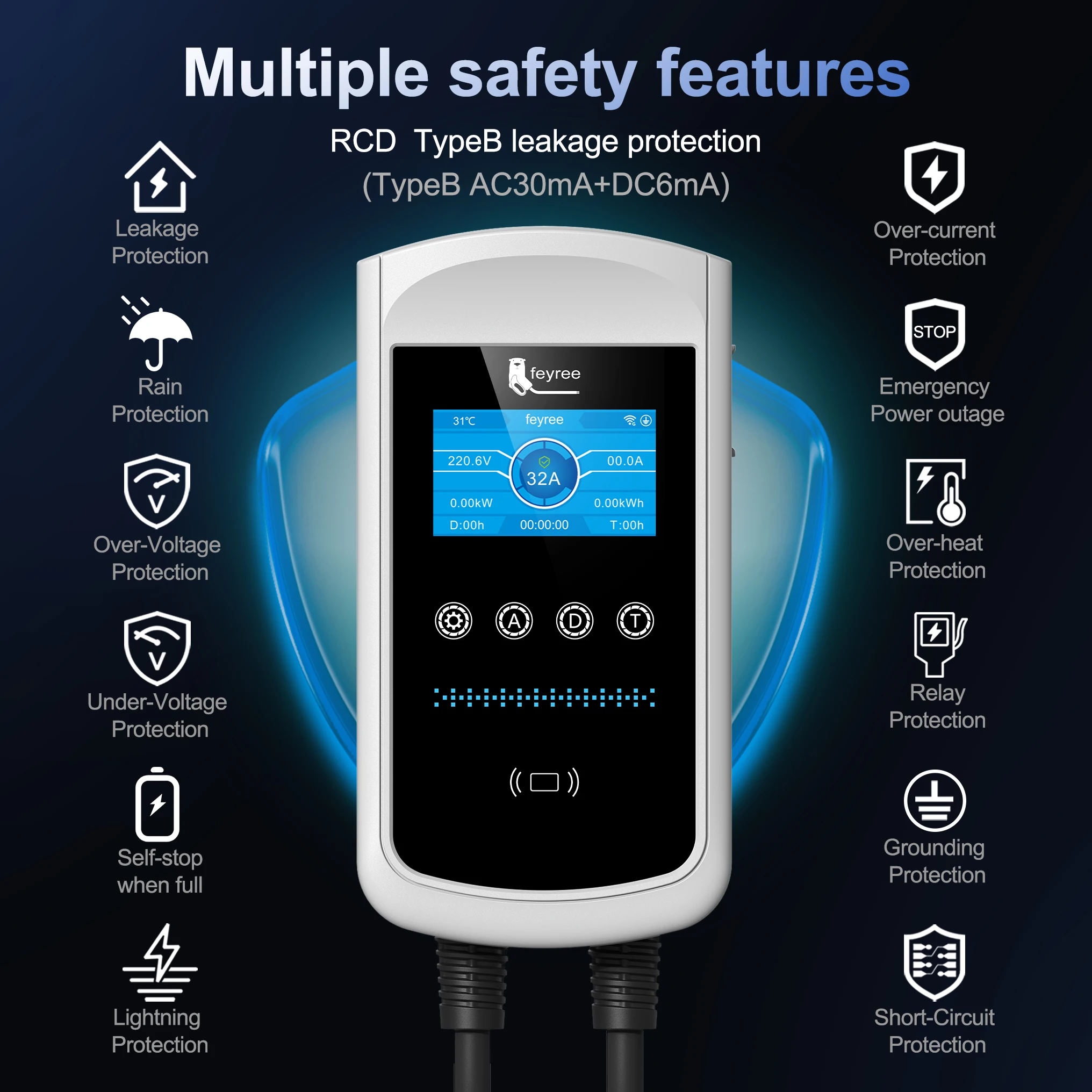 Safety Type B leakage protection: Install with type B AC30mA +DC6mA leakage protection to gurantee your charging safety.