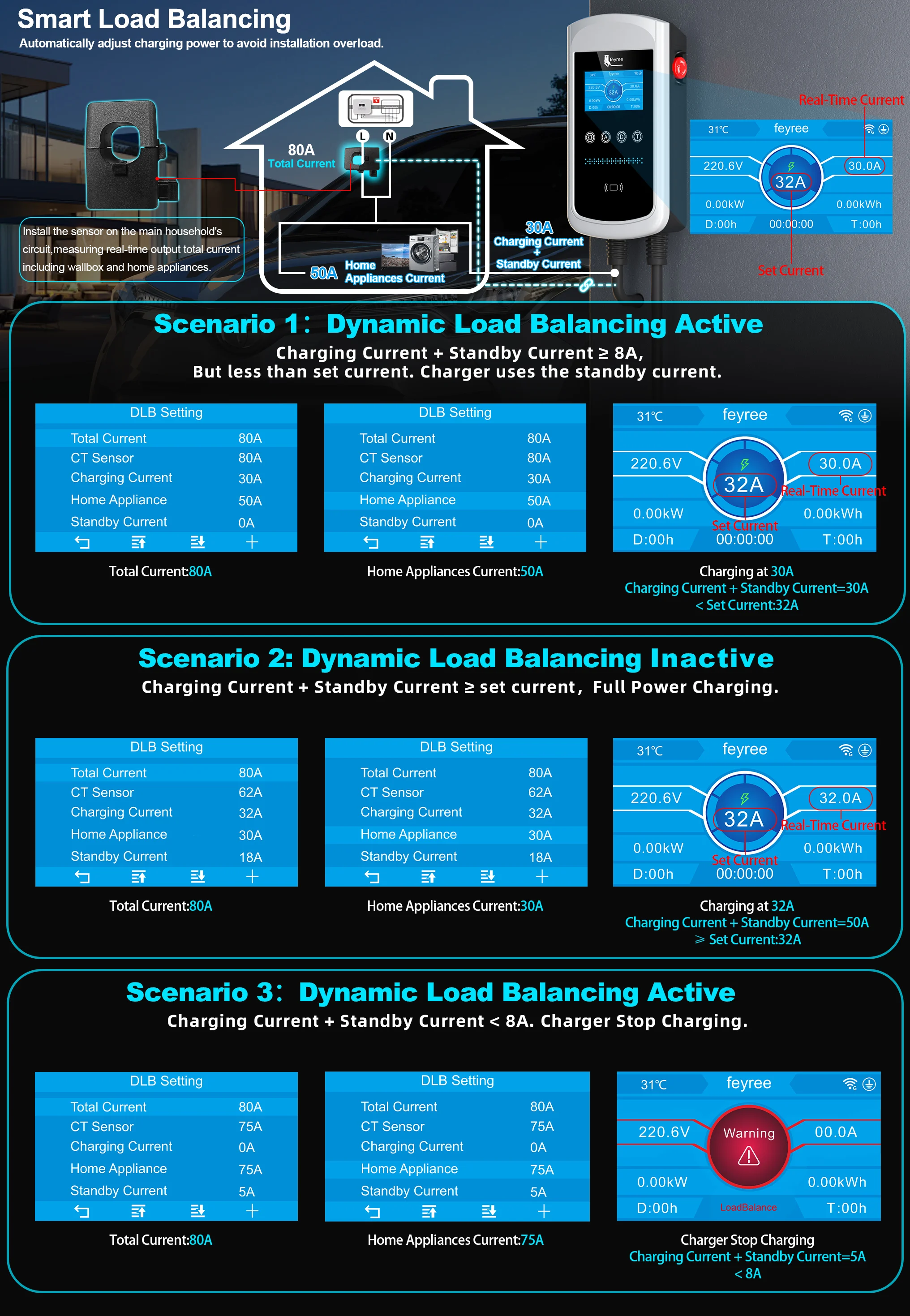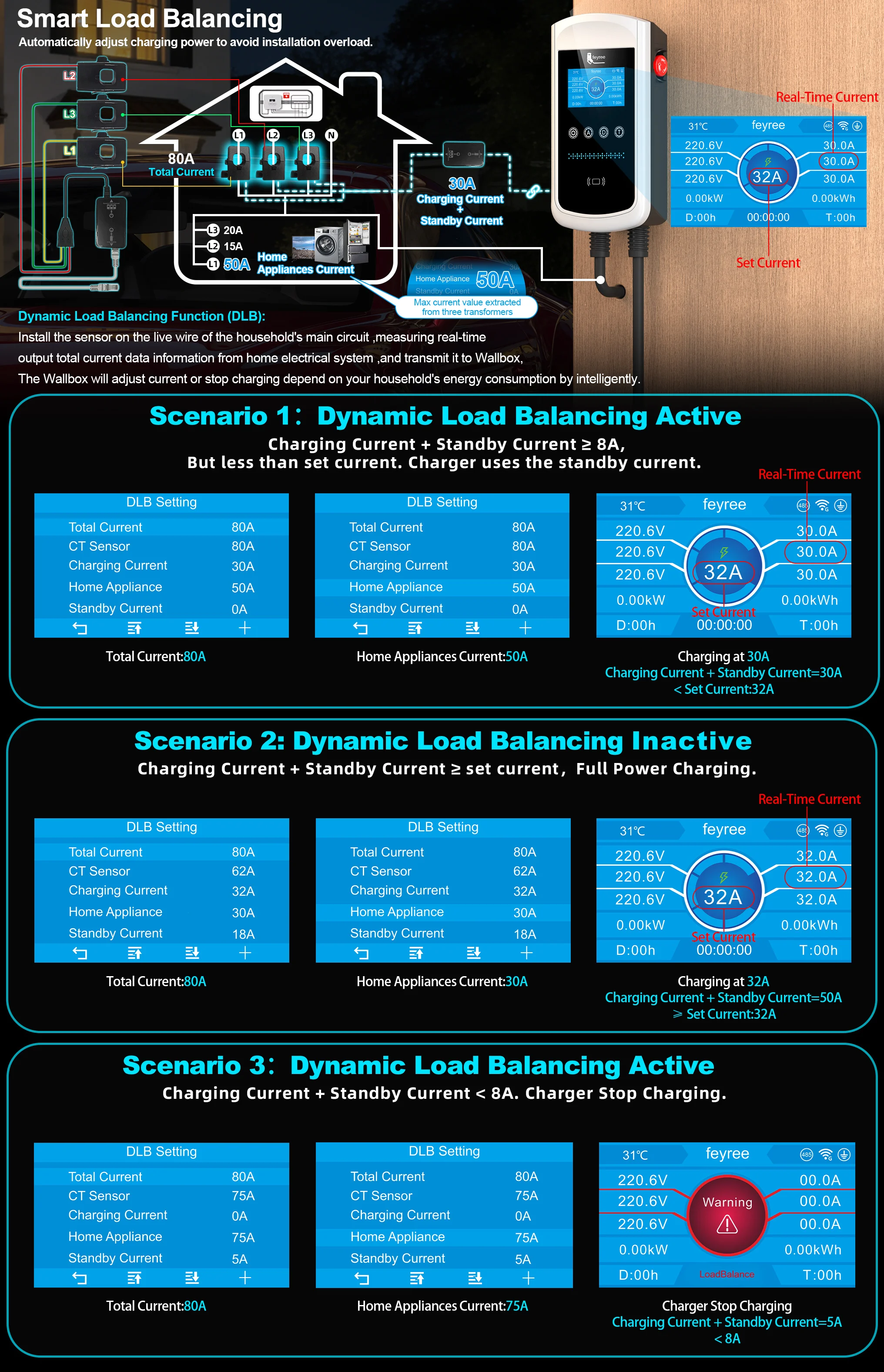 1.Total current set on wallbox - household appliances's current≥8A,The Wallbox will adjust charging current intelligently and charges normally.